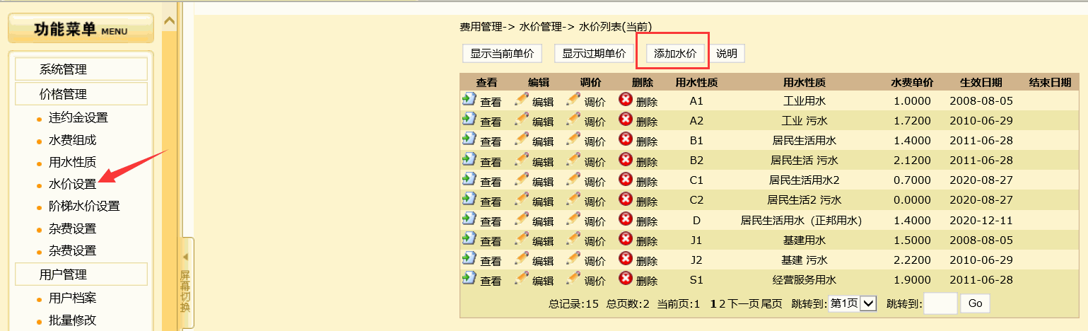 2、价格管理==》水价设置==》添加水价(参照例子:居民生活用水2)