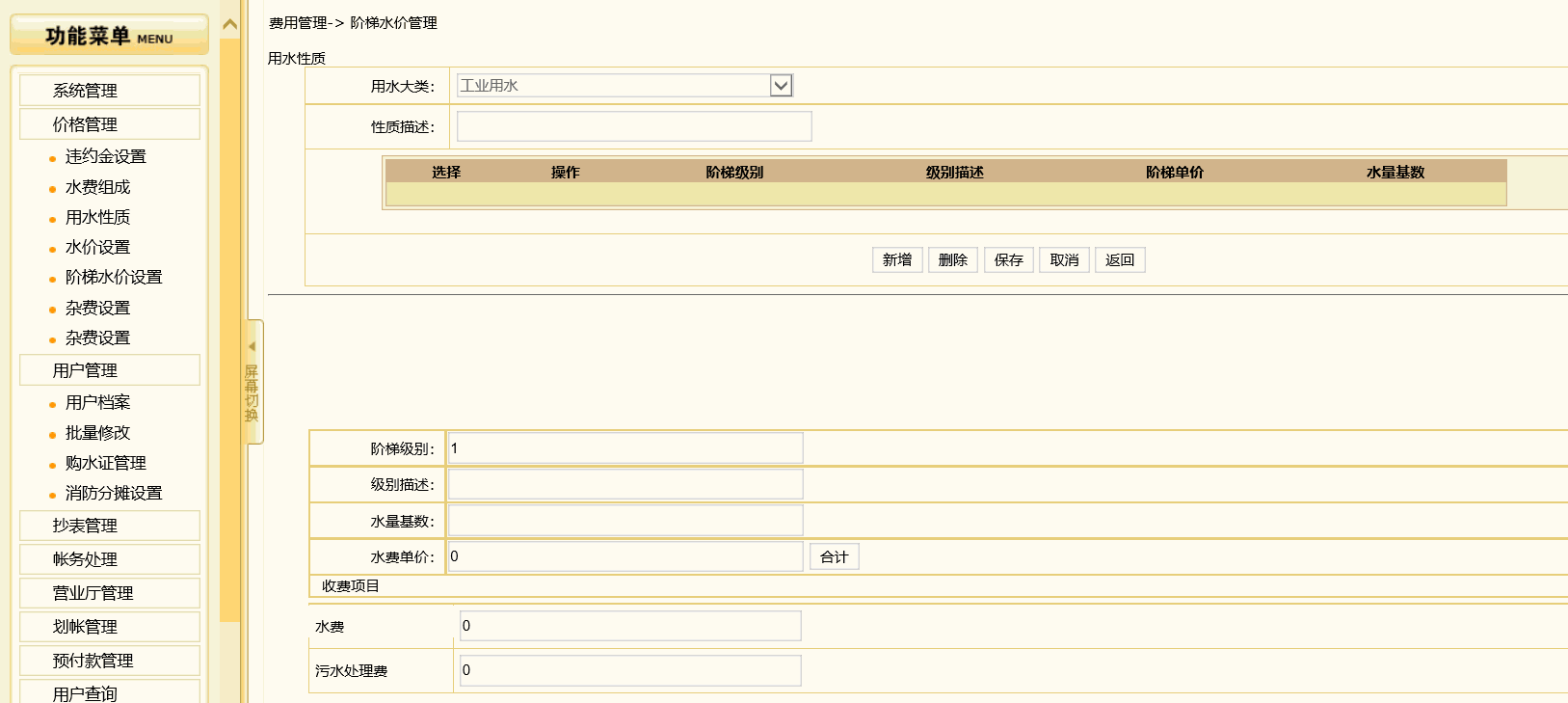3.1编辑==》费用管理==》水价管理==》勾选阶梯设置==》出现阶梯水价管理页面==》新增