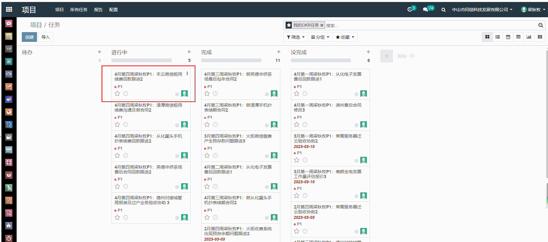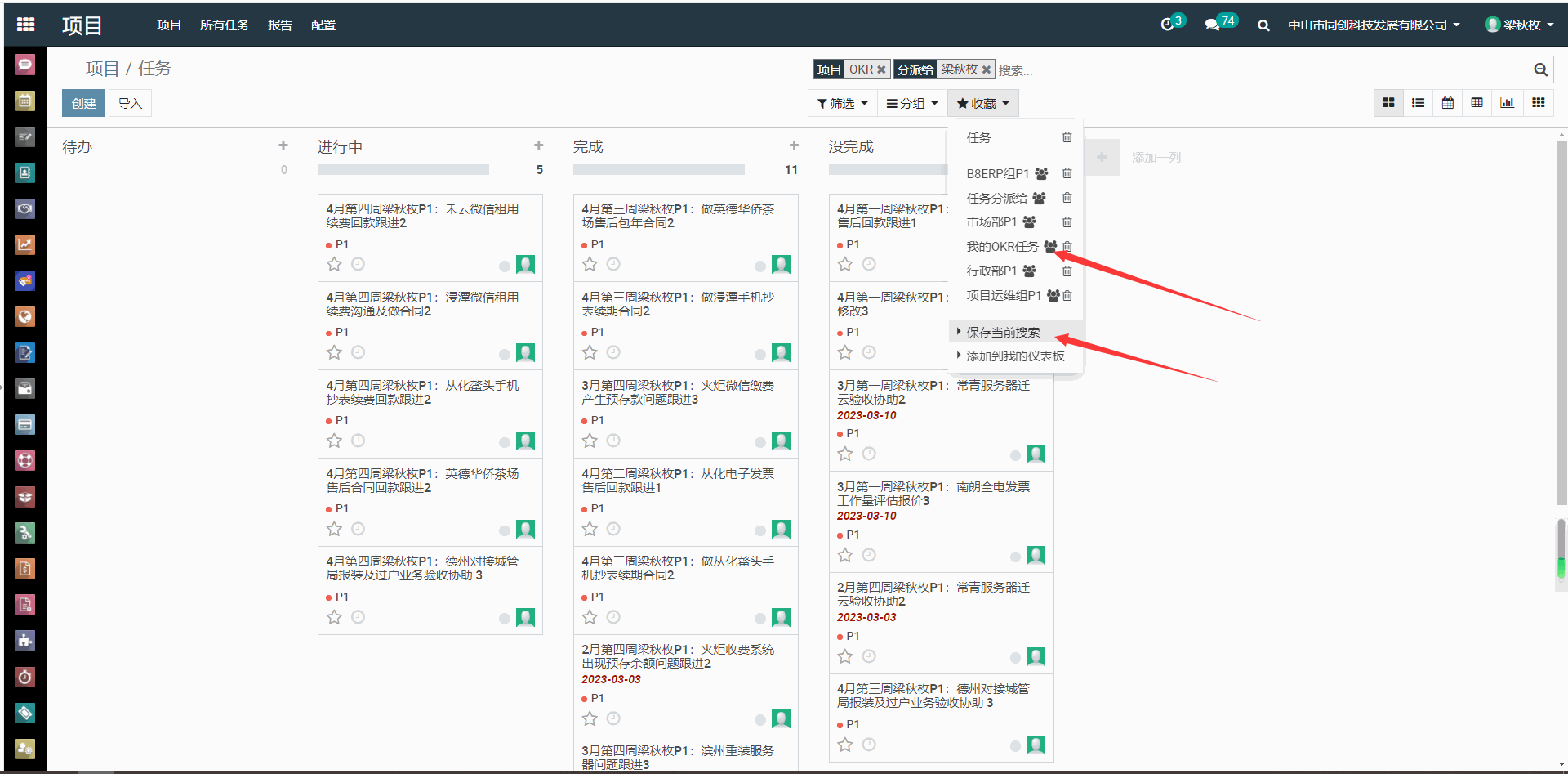 1、 进入ERP---项目---OKR,搜索栏输入自己的名字,例如输入:梁秋枚,选择“分派给为:梁秋枚”,搜索出自己的P1任务