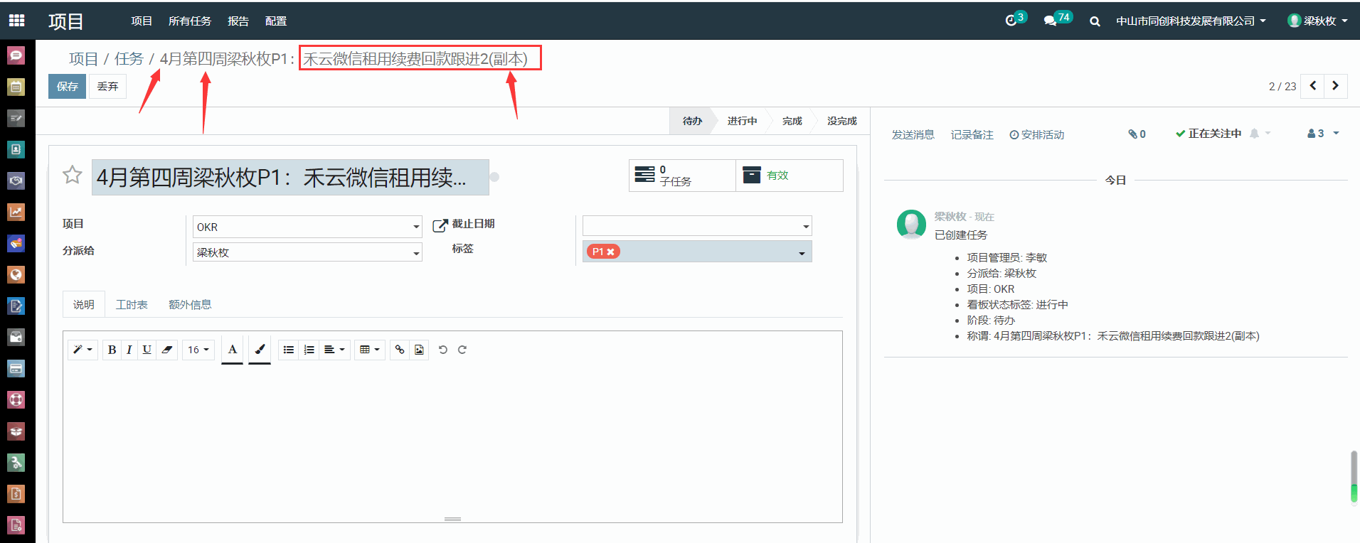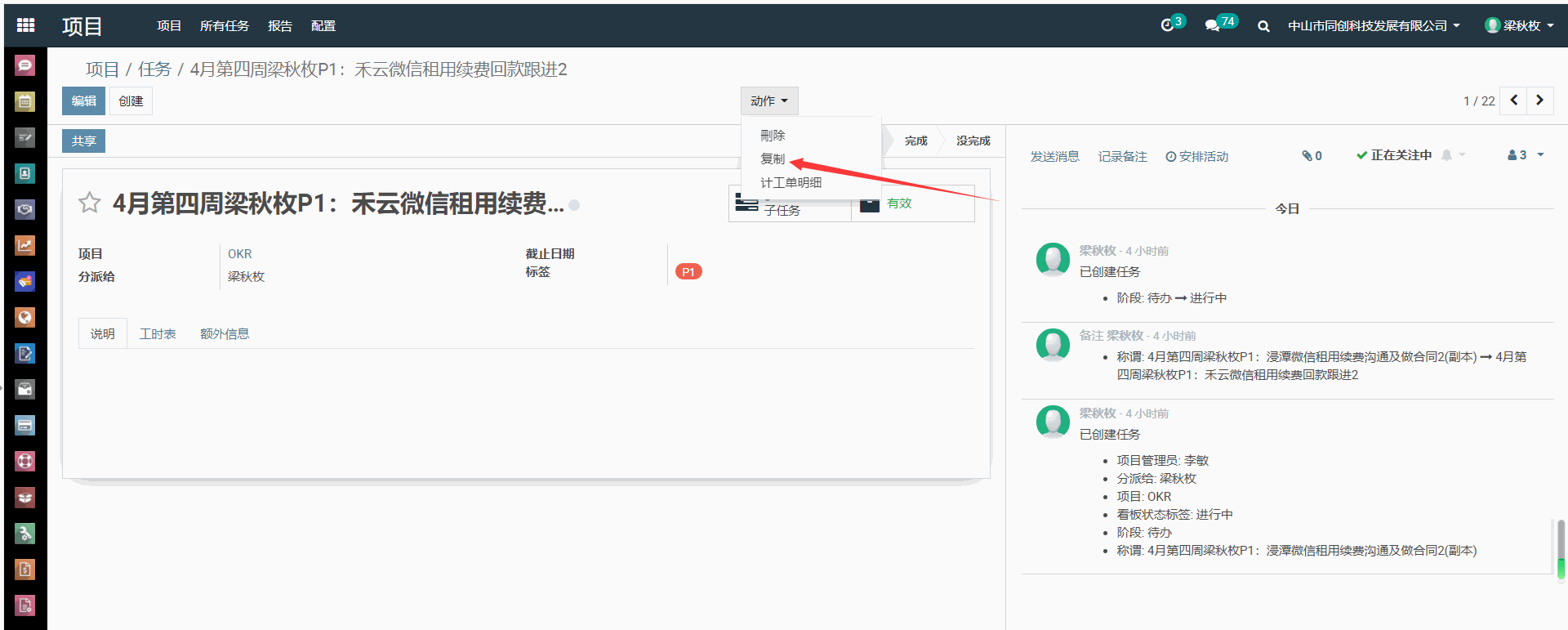 4、选中一条进行中的任务,点进去,在页面中上方,点“动作”,选择“复制”,即可以出现一份副本,修改一下 月份、第几周及P1内容---点“保存”即可。有几个P1就复制几次进行修改。