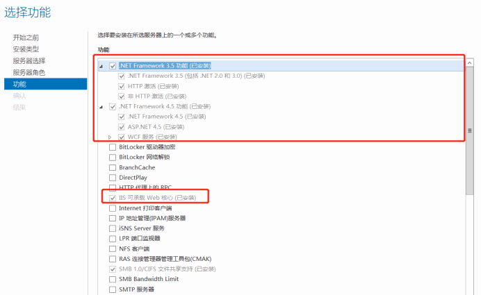 功能这边,勾选.NET Framework 3.5和4.5,需要展开将里面的勾选;(有iis字眼的建议也勾选安装,)选择下一步。