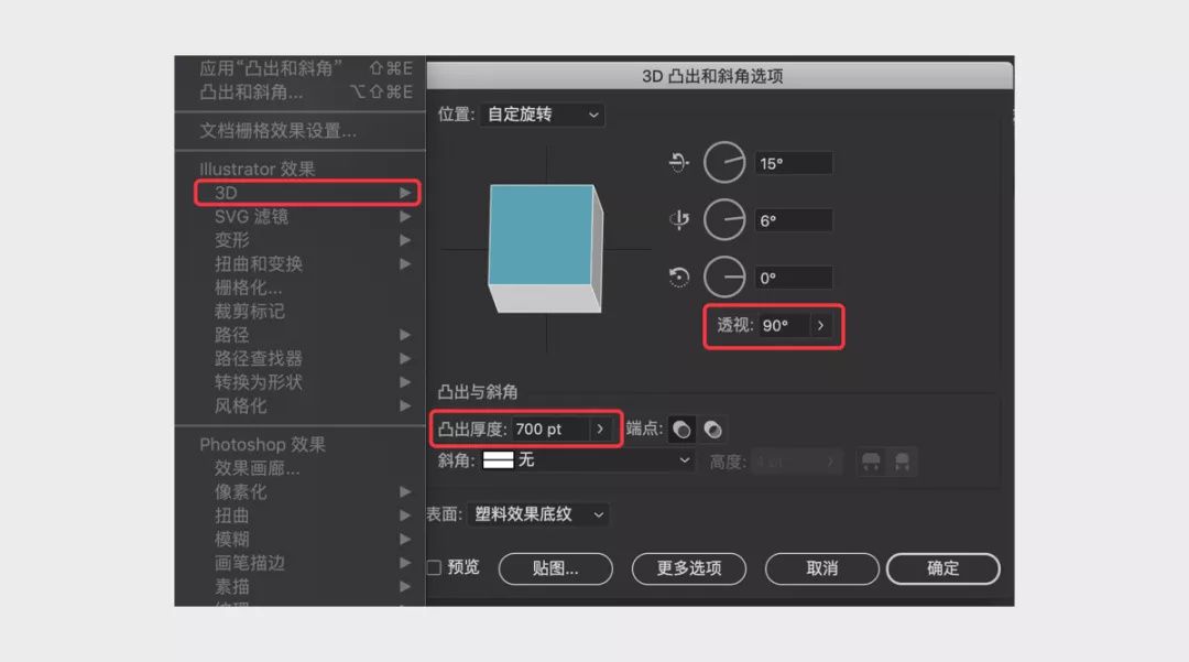 2 个设置:透视和凸出厚度。通过这 2 个内容的再结合角度的设置,可以组合出很多不同的立体效果。